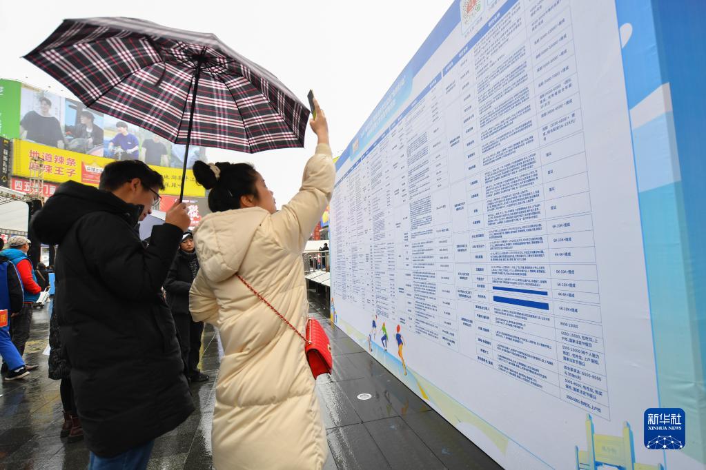 2月11日,在長沙市天心區黃興南路步行街,求職者在招聘活動現場尋找合適崗位并拍照。