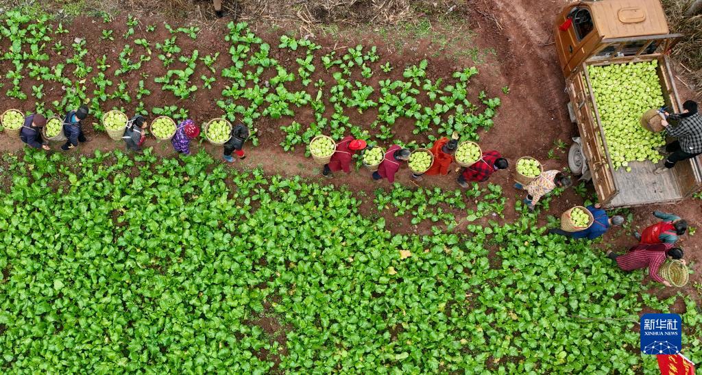 2月10日,南充市嘉陵區安福鎮埡子口村的村民將收獲的青菜頭裝車(無人機照片)。