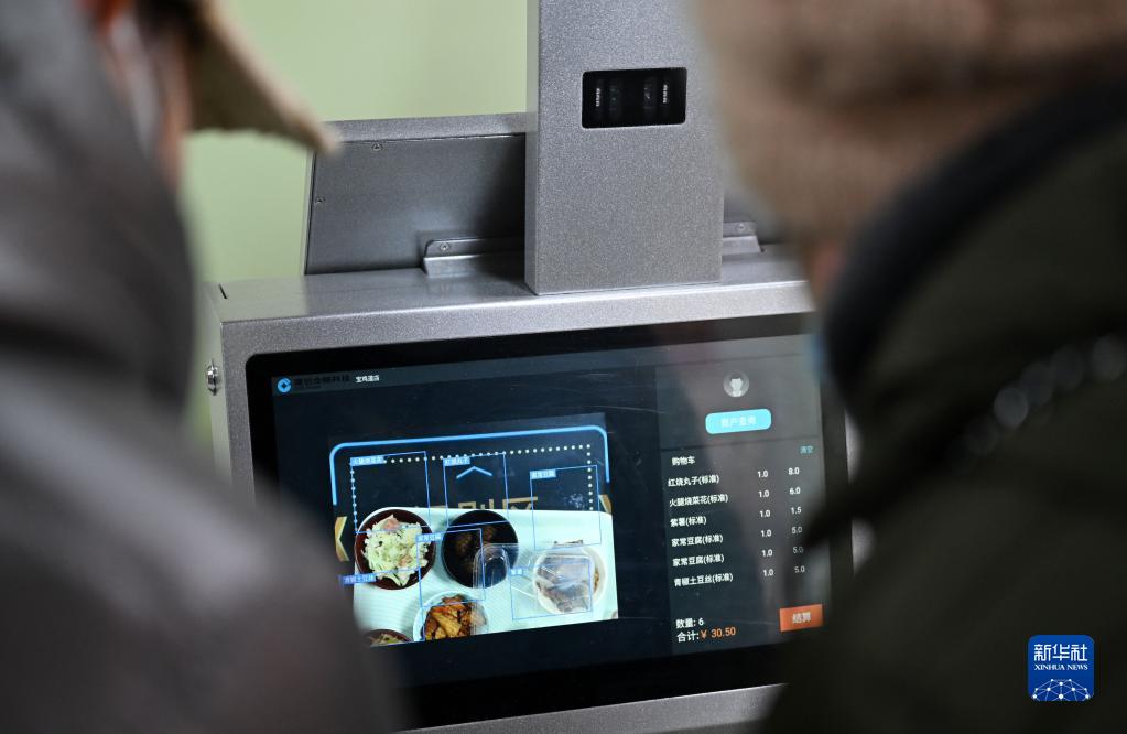 老人在天津市和平區南營門街道的老年人“智慧食堂”通過視覺識別智慧取餐臺結算(2月10日攝)。