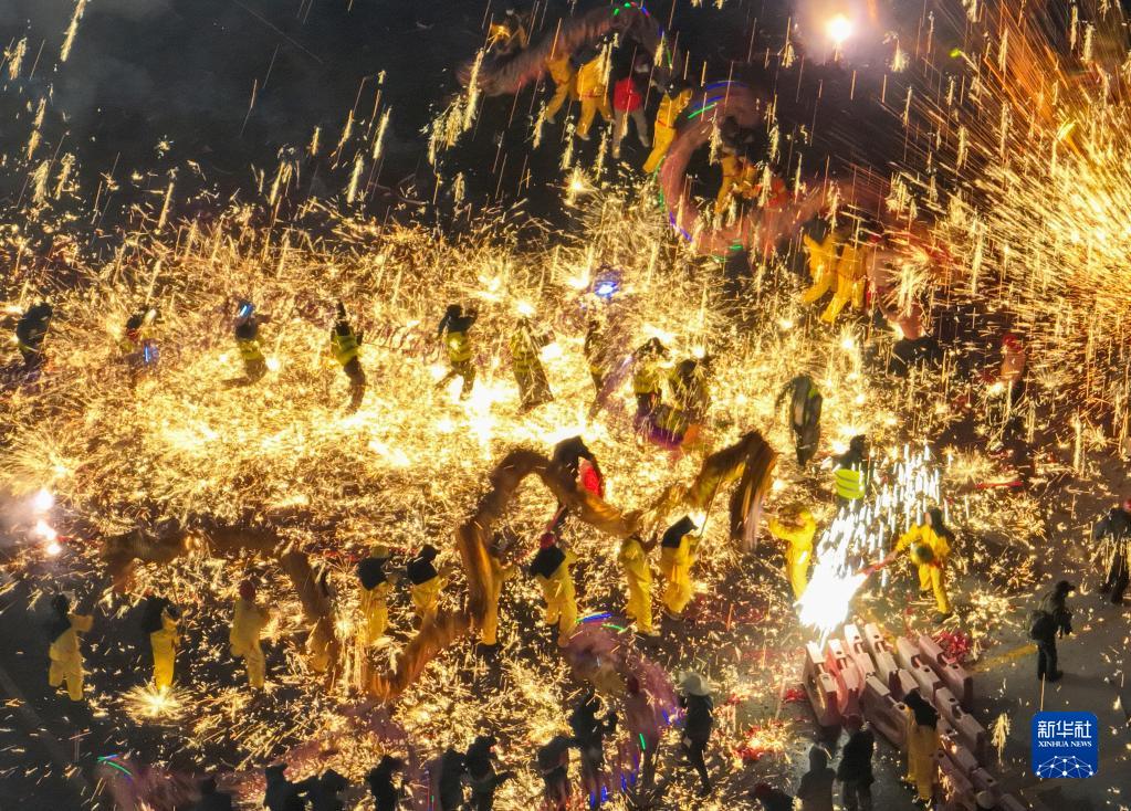 2月5日,在貴州省遵義市新蒲新區新蒲街道中橋村,人們在鐵花中舞龍(無人機照片)。
