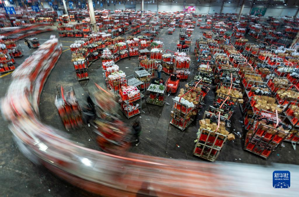 這是在昆明國際花卉拍賣交易中心拍攝的運輸鮮花的臺車(1月31日攝)。
