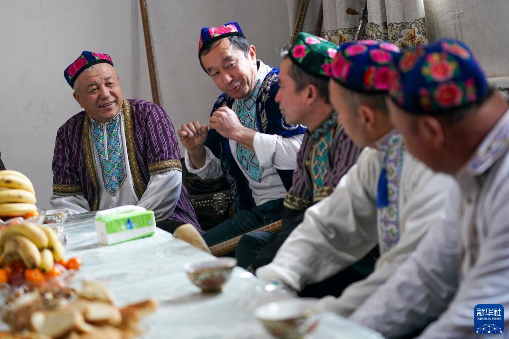在新疆鄯善縣魯克沁鎮木卡姆村,吐魯番木卡姆傳承人蘇來曼·阿不都(左一)和鄉村藝人聊天(2023年1月11日攝)。節慶或者聚會邀請木卡姆藝人一起演奏歌唱,是當地的傳統保留節目。新華社記者 趙戈 攝