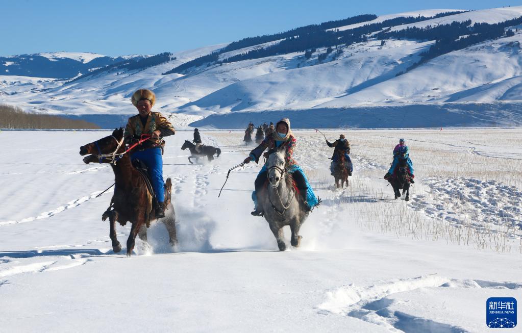 在新疆昭蘇縣薩爾闊布鄉一處雪原上,當地農牧民進行“姑娘追”活動(2022年12月21日攝)?!肮媚镒贰笔枪_克族的傳統馬上體育運動。入冬以來,昭蘇縣各族農牧民開展豐富多彩的民間文化體育活動,豐富冬閑時節生活。新華社發(李文武 攝)