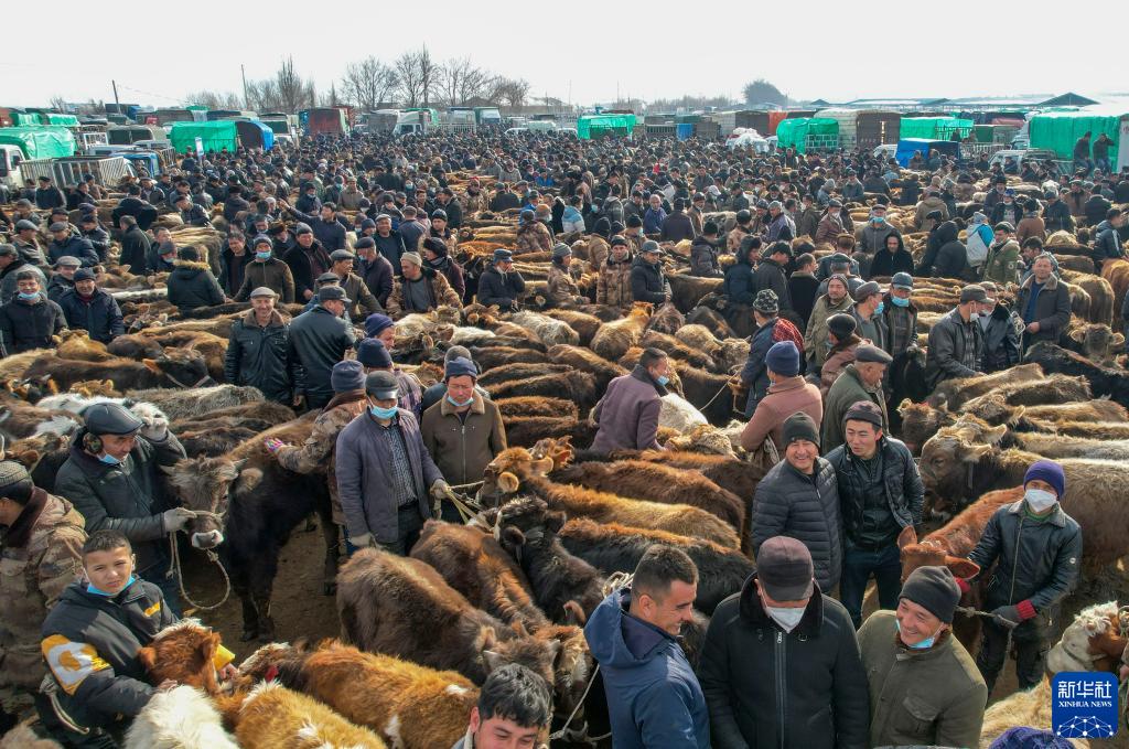 人們在新疆創錦黃公農產品交易市場交易(2023年2月1日攝,無人機照片)。當日,位于新疆伊寧縣愉群翁回族鄉阿勒推村的創錦黃公農產品交易市場開市,市場商品琳瑯滿目,牛羊馬交易火爆。新華社發(劉春星 攝)
