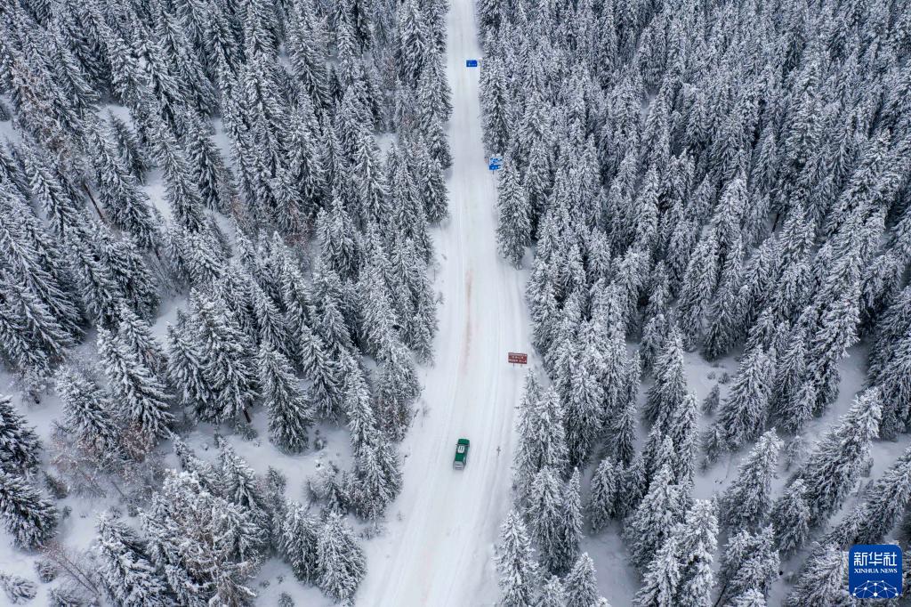 游客駕車在新疆喀納斯景區行駛(2023年1月8日攝,無人機照片)。新華社記者 胡虎虎 攝