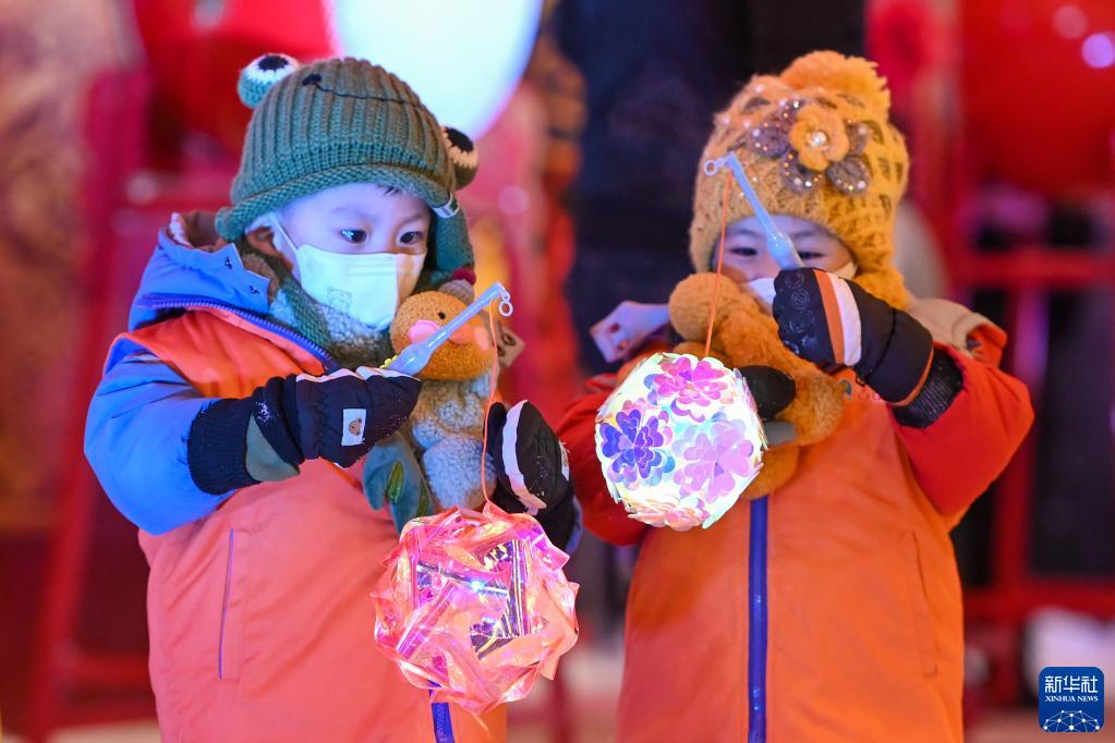 烏魯木齊七一東街廣場,小朋友提著花燈游玩(2023年1月22日攝)。新華社記者 丁磊 攝