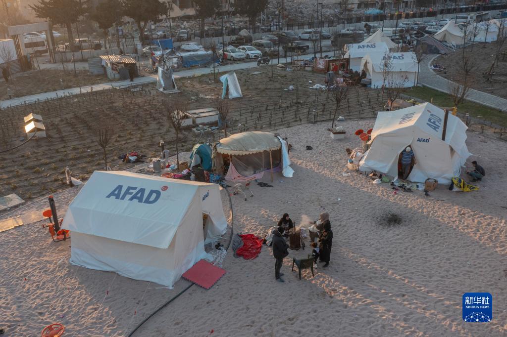2月11日,在土耳其哈塔伊省安塔基亞市,受地震影響的人們在帳篷外休息(無人機拍攝)。