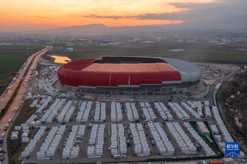 這是2月11日在土耳其哈塔伊省安塔基亞市用無人機航拍的臨時搭建的帳篷。