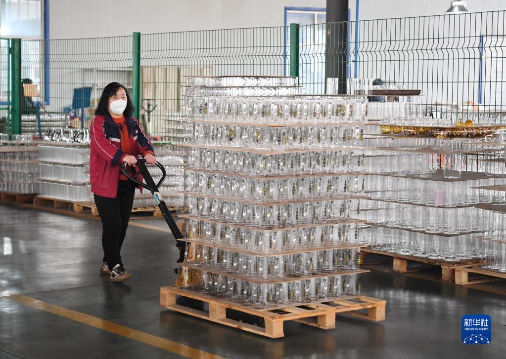 2月11日,河北省河間市一家工藝玻璃制品生產企業工人在車間內搬運產品。