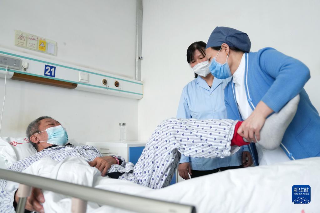 在北京市房山區良鄉醫院神經內科三病區,一位護士(右)為新上崗的薛四四(中)講解科內病人護理的一些知識(2月10日攝)。