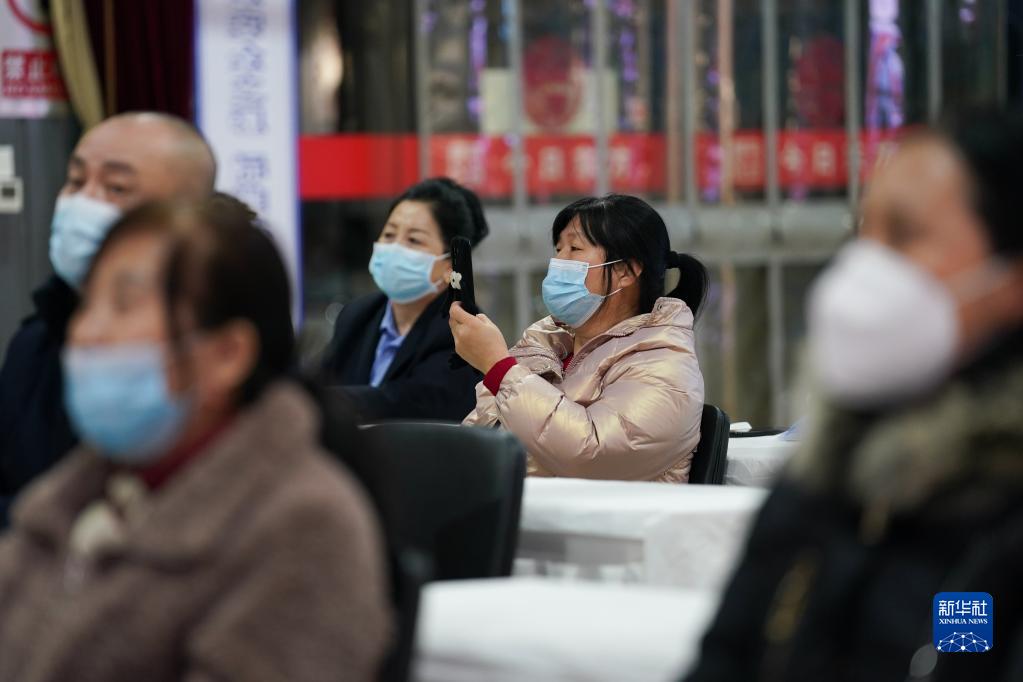 薛四四(右二)在北京市今日東方家政服務公司組織的歡迎儀式上拍攝記錄(2月4日攝)。
