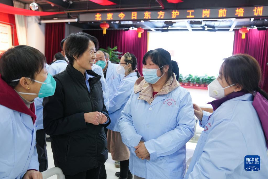 薛四四(右二)在北京市今日東方家政服務公司的護工崗前培訓上與老師交流(2月4日攝)。