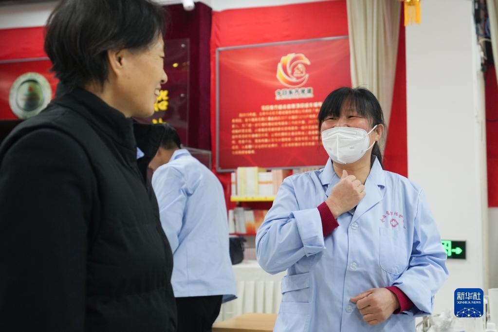 薛四四(右)在北京市今日東方家政服務公司的護工崗前培訓上與老師交流(2月8日攝)。
