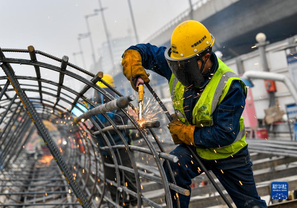在天津地鐵8號線一期工程5標項目南珠橋站施工現場,建設者進行焊接作業(2月11日攝)。