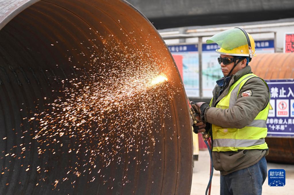 在天津地鐵8號線一期工程5標項目南珠橋站施工現場,建設者進行切割作業(2月11日攝)。