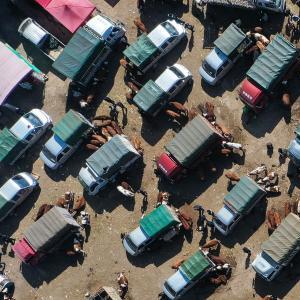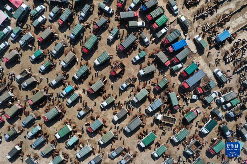 這是2月11日拍攝的貴州省威寧縣小海鎮牲畜交易市場(無人機照片)。
