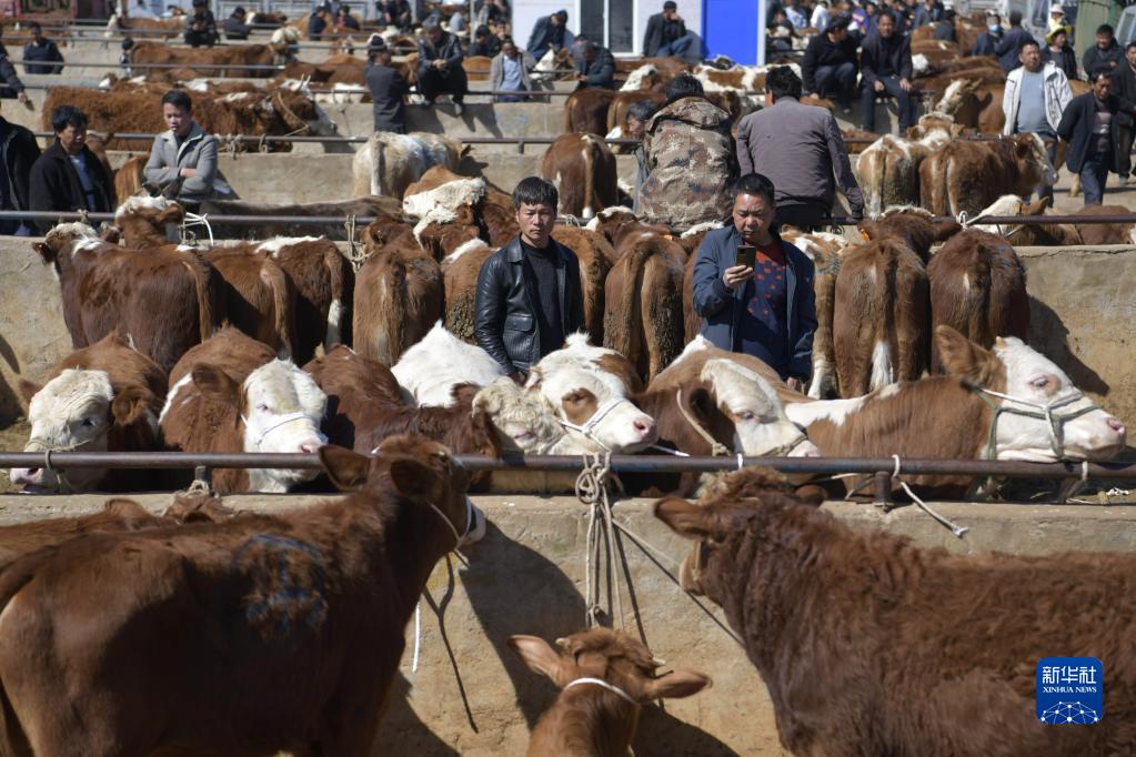 近日,貴州省威寧縣牛市交易迎來旺季。來自云南、四川、廣西及貴州當地的農戶和商販聚集到該縣小海鎮牲畜交易市場,選購和銷售耕牛、能繁母牛等,以便及時投入到春耕備耕生產中。