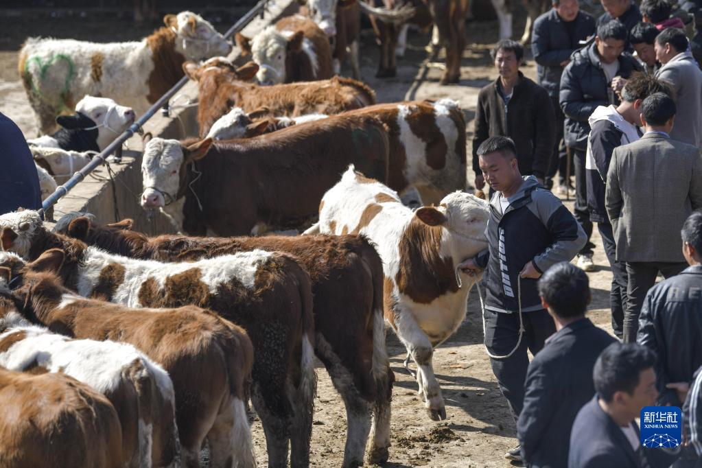 近日,貴州省威寧縣牛市交易迎來旺季。來自云南、四川、廣西及貴州當地的農戶和商販聚集到該縣小海鎮牲畜交易市場,選購和銷售耕牛、能繁母牛等,以便及時投入到春耕備耕生產中。