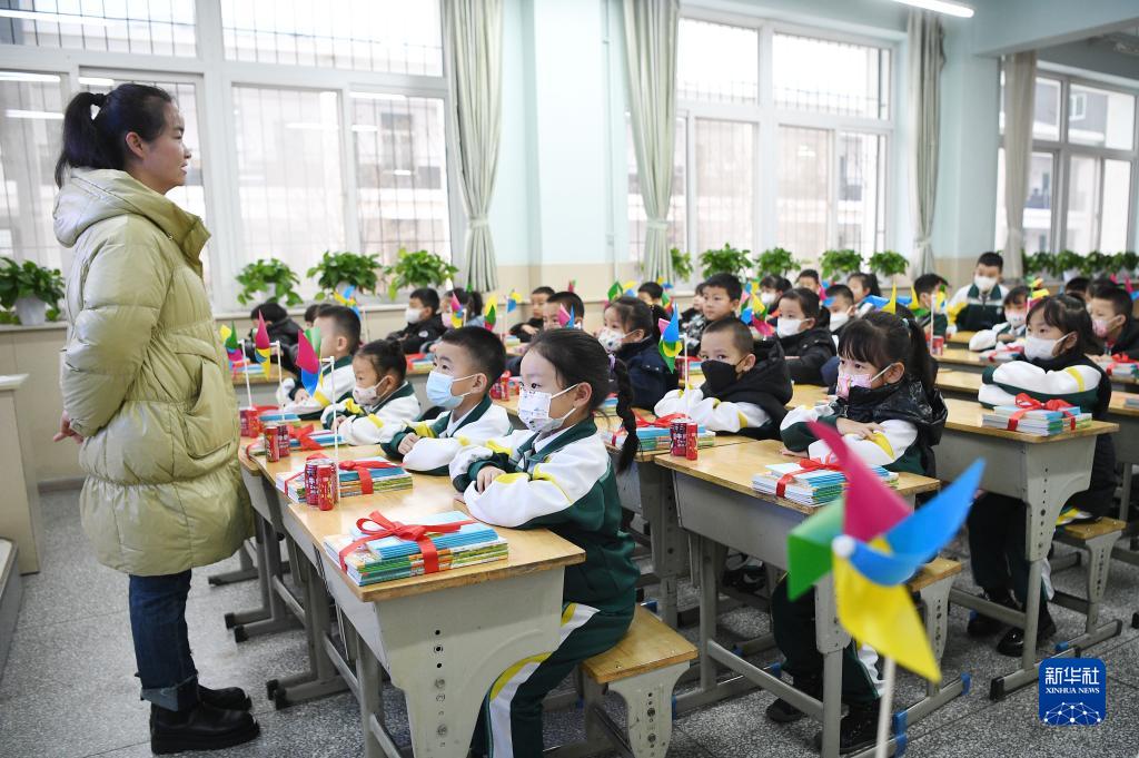 2月12日,銀川市興慶區實驗二小學生在布置一新的教室里迎來新學期。