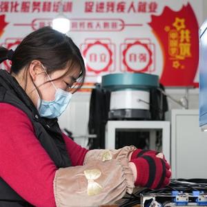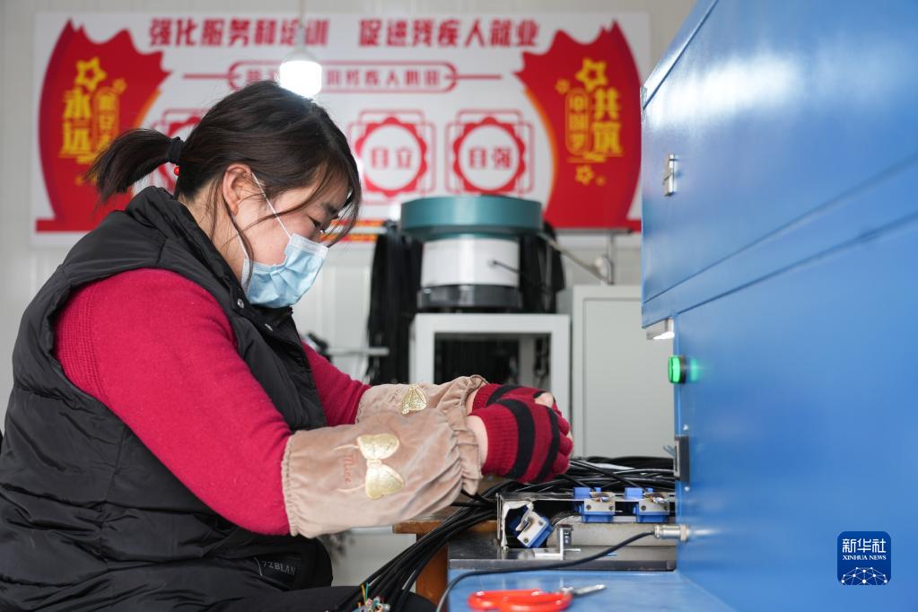 2月12日,在山東鄒城市太平鎮如康家園內,殘疾人在進行電纜加工。