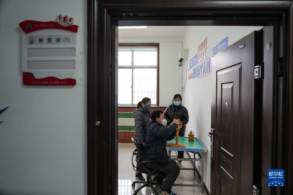2月12日,在山東鄒城市鋼山街道龍山社區如康家園內,殘疾人在工作人員陪護下進行康復訓練。