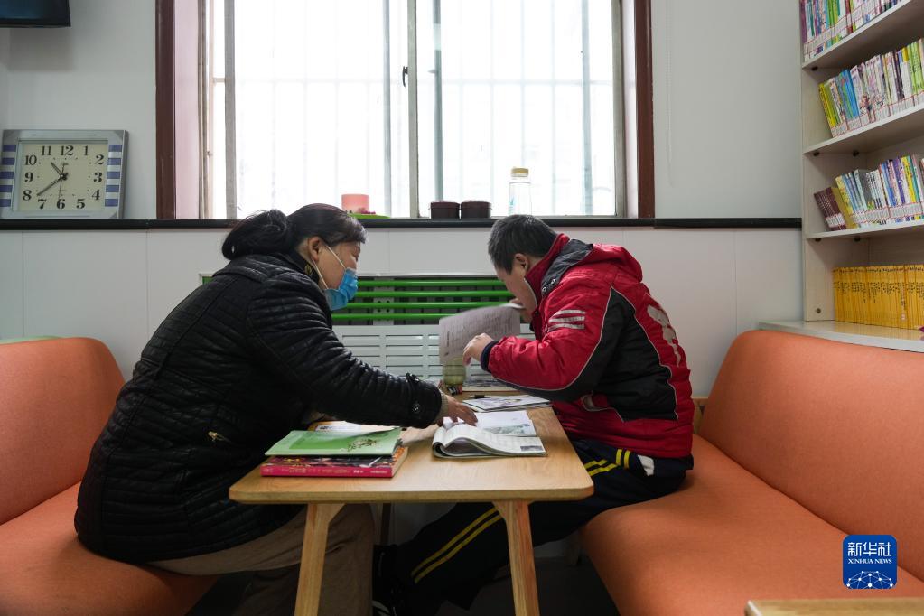 2月12日,在山東鄒城市鋼山街道龍山社區如康家園內,殘疾人(右)在工作人員陪護下閱讀書籍。