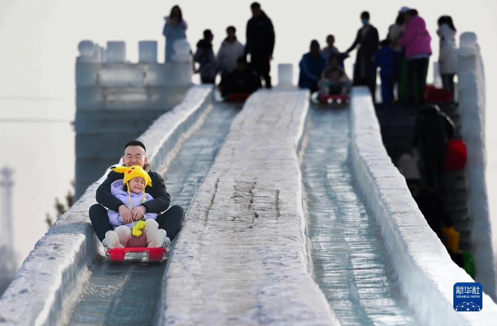2月12日,游客在呼和浩特冰雪節冰雪景區體驗冰滑梯。
