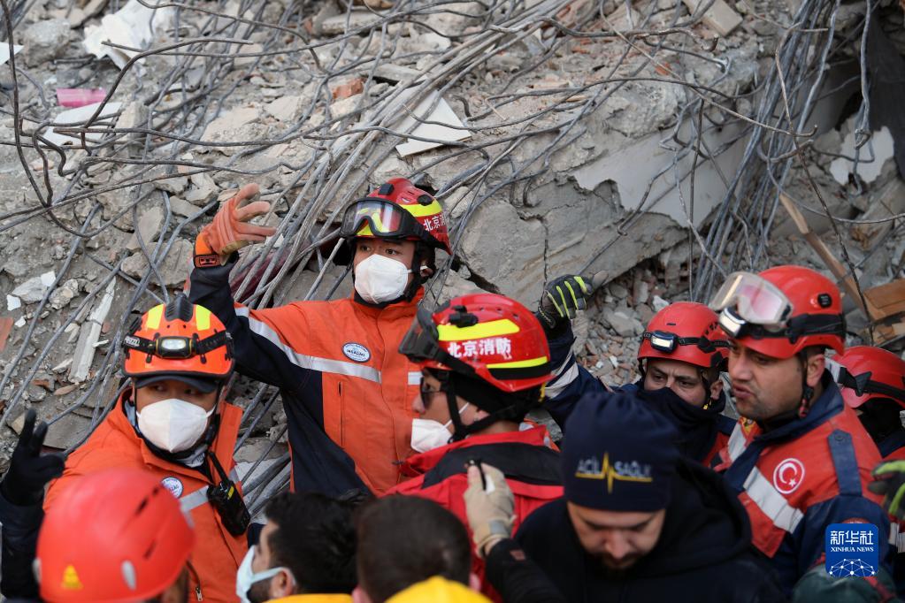 2月12日,中國救援隊在土耳其哈塔伊省安塔基亞市參與搜救。