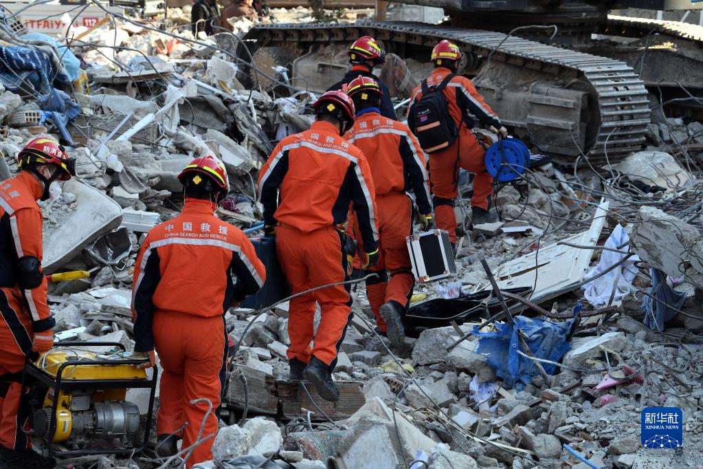 2月12日,中國救援隊隊員在土耳其哈塔伊省安塔基亞市一處地震廢墟開展救援工作。