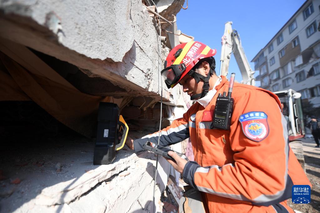 2月12日,中國救援隊隊員在土耳其哈塔伊省安塔基亞市一處地震廢墟開展救援工作。