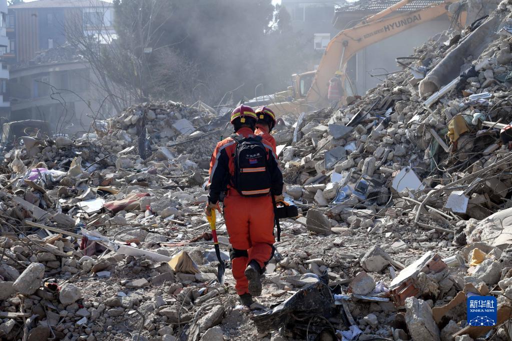 2月12日,中國救援隊隊員在土耳其哈塔伊省安塔基亞市一處地震廢墟開展救援工作。