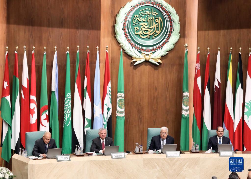 2月12日,在位于埃及首都開羅的阿拉伯聯盟總部,埃及總統塞西、巴勒斯坦總統阿巴斯、約旦國王阿卜杜拉二世、阿盟秘書長蓋特(從右至左)出席會議。