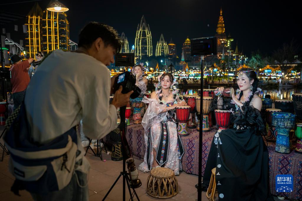 夜幕降臨,位于云南省西雙版納傣族自治州景洪市的告莊西雙景星光夜市流光溢彩,游人如織。富有民族風情的旅拍受到游客青睞,成為熱門體驗項目,拉動城市“夜經濟”發展。