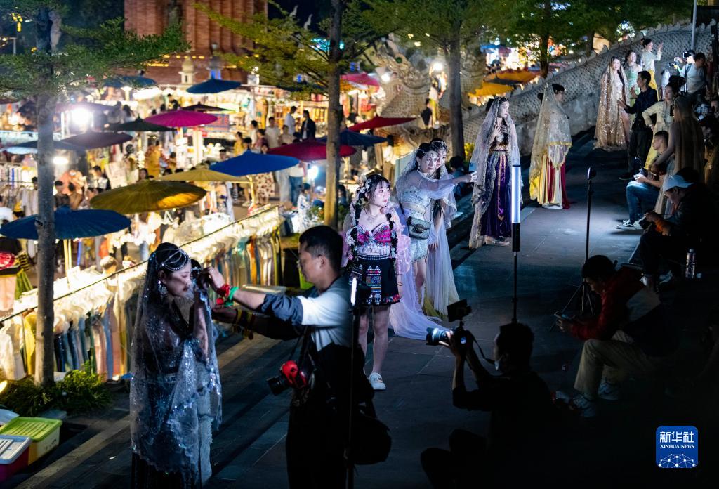 夜幕降臨,位于云南省西雙版納傣族自治州景洪市的告莊西雙景星光夜市流光溢彩,游人如織。富有民族風情的旅拍受到游客青睞,成為熱門體驗項目,拉動城市“夜經濟”發展。