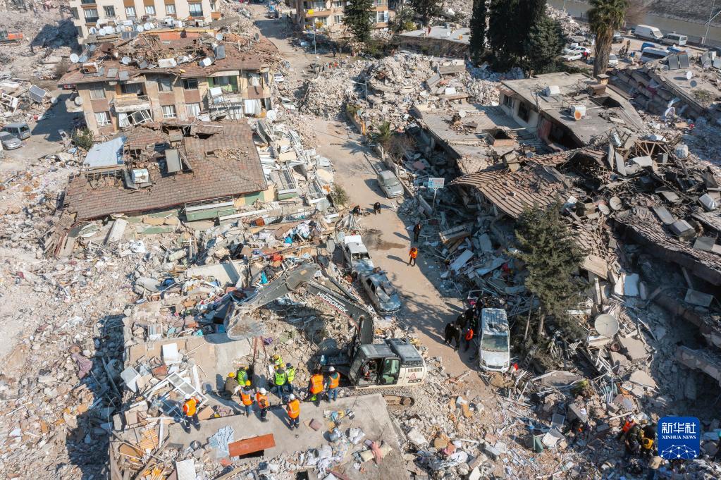 這是2月12日在土耳其哈塔伊省安塔基亞市中心拍攝的地震廢墟(無人機照片)。
