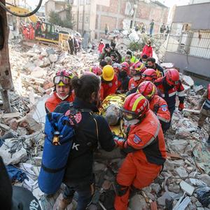2月12日,在土耳其哈塔伊省安塔基亞市,中土兩國救援隊隊員轉移一名救出的幸存者。
