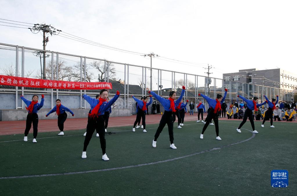 2月13日,北京二中學生在新學期開學典禮上表演舞蹈《奔向未來》。