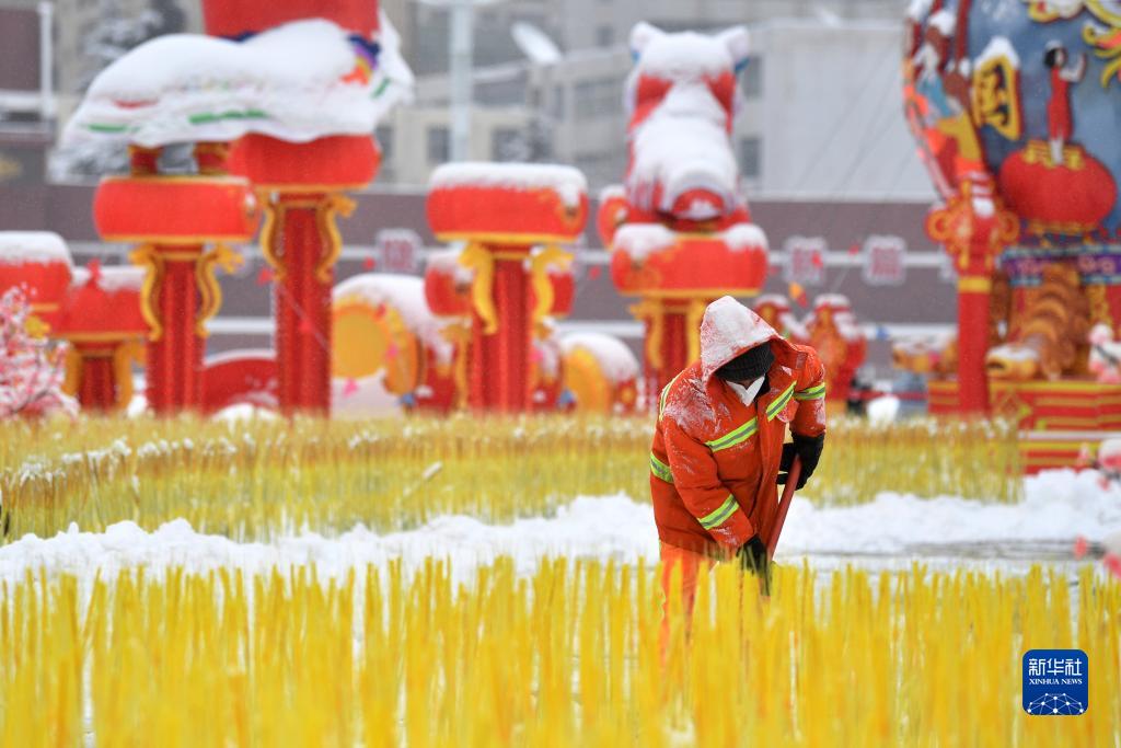 2月13日,一名環衛工人在蘭州市城關區東方紅廣場清理積雪。