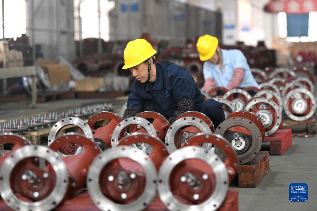 2月13日,工人在福建福州閩侯縣的毅飛泵業(福州) 有限公司生產線上組裝水泵部件。