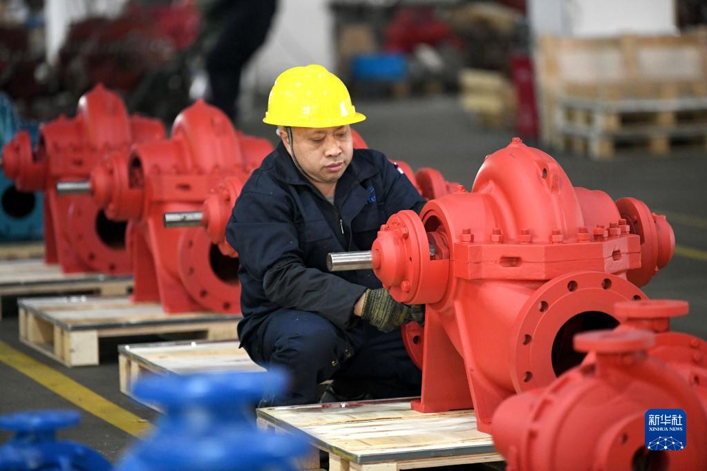 2月13日,工人在福建福州閩侯縣的毅飛泵業(福州) 有限公司生產線上作業。