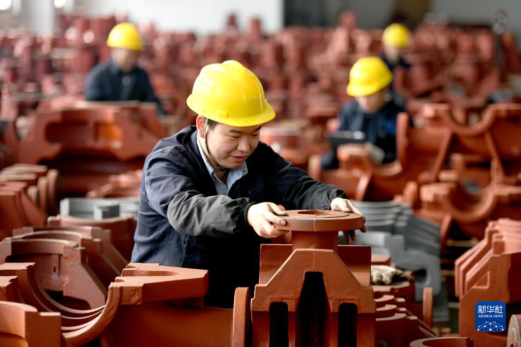 2月13日,工人在福建福州閩侯縣的毅飛泵業(福州) 有限公司生產線上組裝水泵部件。