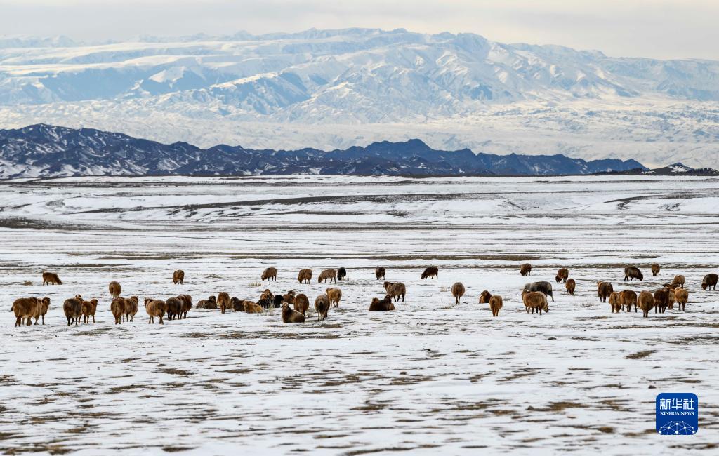羊群在新疆裕民縣巴爾魯克山南坡的冬牧場上覓食(2月9日攝)。