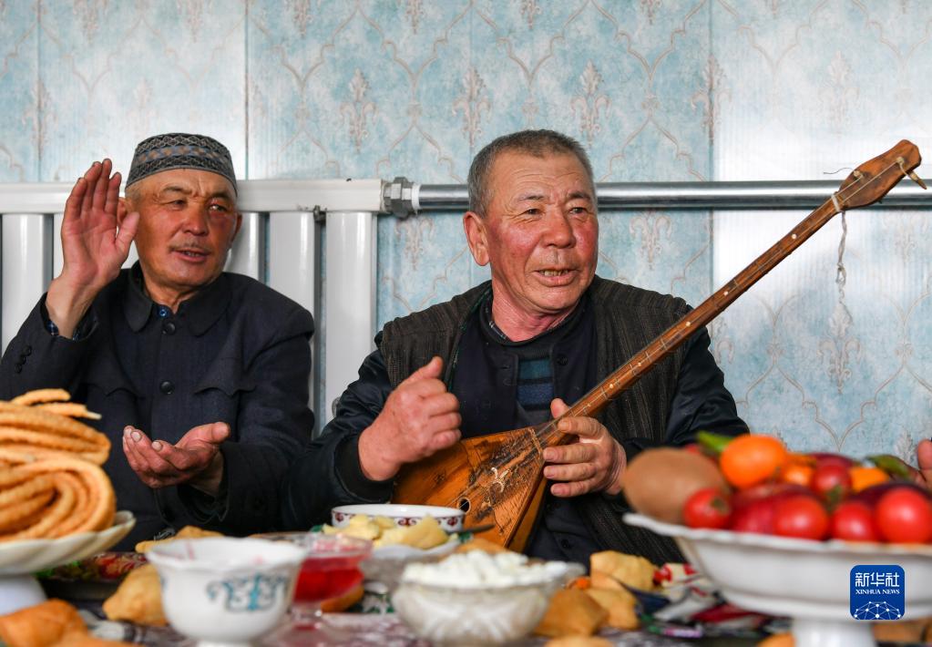 在一次鄰里聚會上,巴爾魯克山區牧民木拉提(右)即興彈唱歌曲,身邊的朋友沉醉其中,打著節拍(2月12日攝)。