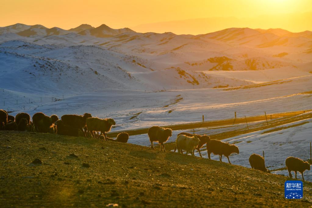 新疆裕民縣巴爾魯克山區,夕陽映照牧場,羊群歸來(2月11日攝)。