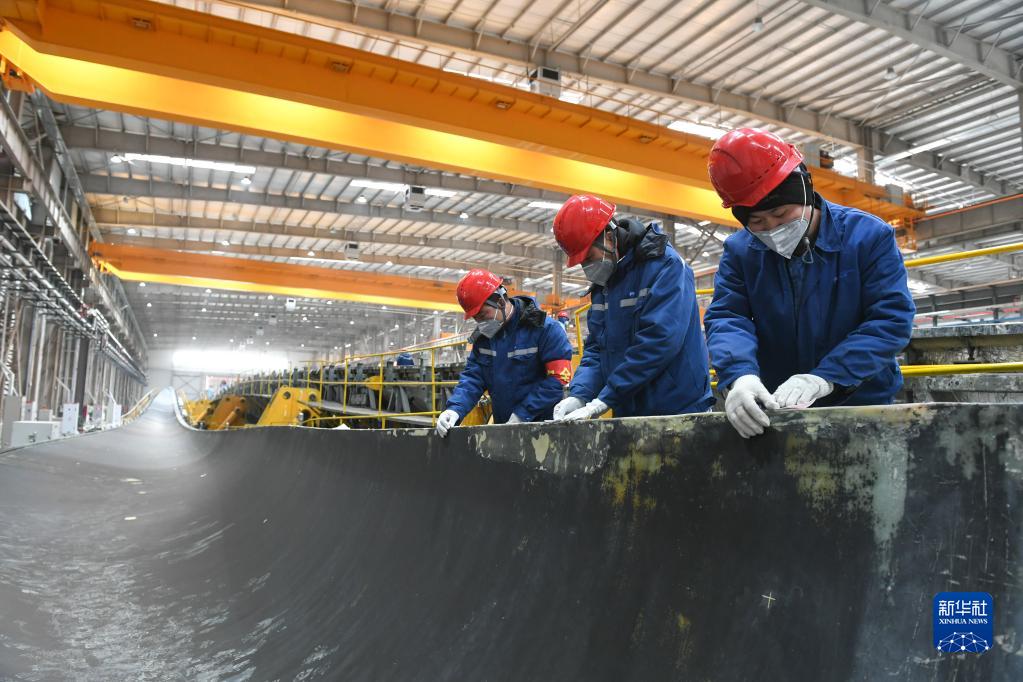 2月13日,工人在內蒙古包頭市明陽新能源裝備智能制造產業園風力發電葉片生產車間內作業。