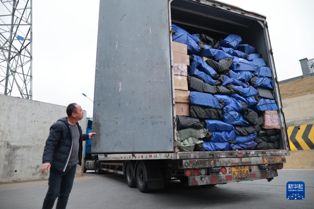 2月13日,一名貨車司機在貴州快遞物流園內打開運送快遞的貨車車門。
