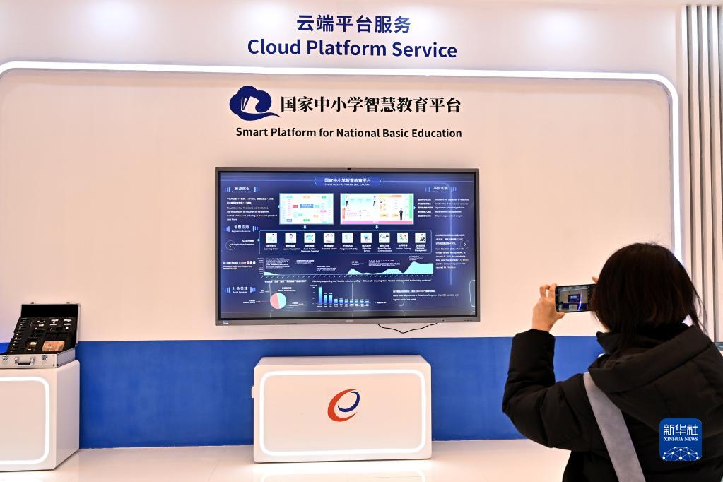 2月13日,一名與會者在數字化教育裝備應用展示區域參觀拍攝。