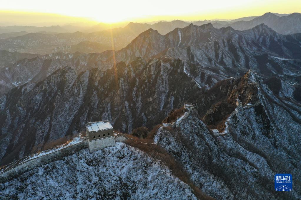 夕陽下的箭扣長城(2月13日攝,無人機照片)。
