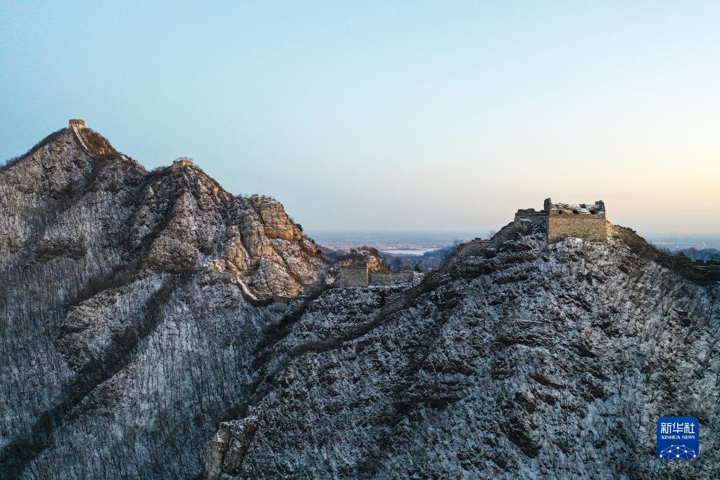 夕陽下的箭扣長城雪景(2月13日攝,無人機照片)。