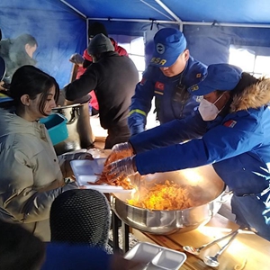 2月13日,中國藍天救援隊在土耳其馬拉蒂亞向當地受災民眾分發食物。